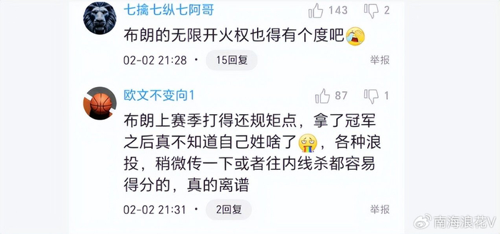 布朗是上赛季夺冠英雄,被评为总决赛MVP。但从此也飘了,飘得似乎不知自己姓什么了。球迷怒批道,“布朗上赛季打得还规矩点,拿了冠军之后真不知道自己姓啥了,各种浪投,稍微传一下或者往内线杀都容易得分的,真的离谱”、“布朗的无限开火权也得有个度吧”。广厦再任由布朗这么打,这赛季完了,最近几场都没什么配合,全是抡,都想当大哥,心态完全不对,太飘了。