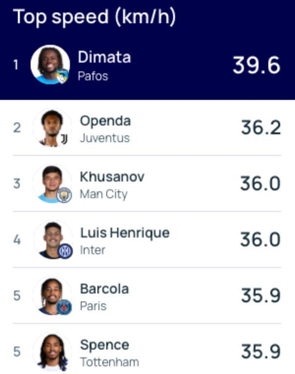 第三个,28岁的迪马塔应该是中超速度最快的球员了。本赛季他在欧冠就创造了39.6公里每小时的冲刺速度,排在本赛季欧冠冲刺速度第一名,断崖式领先,甚至不输一些短跑运动员,堪称“足坛博尔特”,来中超这速度就是降维打击了。