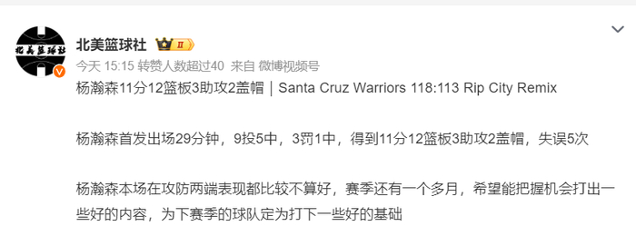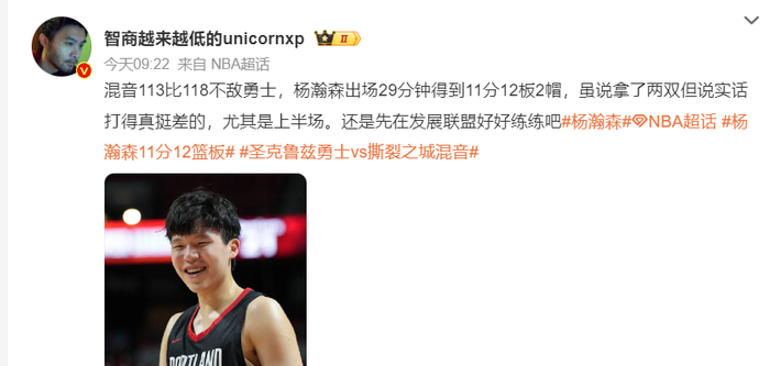 北京时间2月23日,G联赛常规赛,撕裂之城混音队113-118不敌圣克鲁兹勇士队,这场比赛之前开拓者将杨瀚森下放到G联赛,此役杨瀚森代表混音出任先发五号位,上半场杨瀚森发挥极差,好在下半场勇士专注度下滑杨瀚森才连续得分。 上半场杨瀚森5中1,拿到2分5篮板2助攻3失误,命中率只有20%,作为一个身高2.18米的内线效率太差,而跟他对位的博尔登(2.08米)半场已经拿到16分4篮板,杨瀚森算是被博尔登给吊打了。 第三节杨瀚森终于迎来了复苏,这一节杨瀚森3中3拿到7分5篮板,三节打完杨瀚森拿到9分10篮板3助攻。 全场比赛杨瀚森29分钟,9中5,三分1中0,罚球3中1,拿到11分12篮板3助攻5失误2盖帽,命中率52.6%,杨瀚森这个表现是真的差。 博尔登这场比赛抓着杨瀚森打,因为杨瀚森脚步移动不足防不出来,博尔登32分钟,18中9,三分13中8,拿到30分6篮板1盖帽,命中率50%,三分命中率61.5%,杨瀚森此役在攻防两端发挥都很差。 赛后欧洲篮球专家王健写道:杨瀚森拿到11分12篮板,虽说拿了两双但实话打得挺差的,尤其是上半场,他还是应该在G联赛好好练练吧。 北美篮球社:杨瀚森本场在攻防两端表现都不算好,赛季还有一个多月,希望能把握机会打出一些好的内容,为下赛季的球队定位打下一些好的基础。