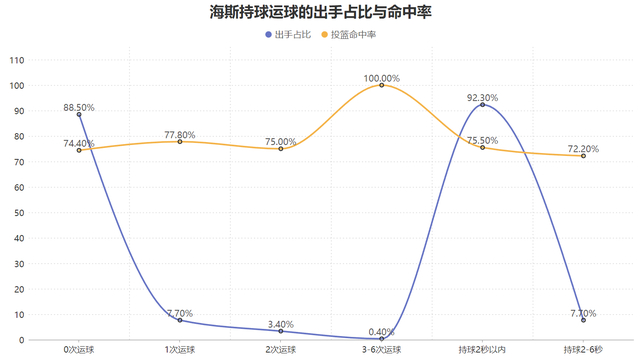 同时海斯96.2%的出手都来自接球不再运球的直接终结与1次运球后的终结,结合他的出手区域来看他的得分需要满足两个前提,其一是在三秒区内,其二是接到球后不过多调整就完成终结,虽然不够全面但在湖人队内有三大传球大师的帮助下让他吃饼吃到饱。