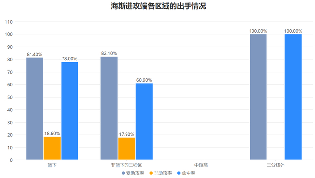 海斯本赛季的出手几乎都集中在三秒区内,三分线外一共仅出手了两次,并且他各区域的得分受助攻率远大于非助攻率,这意味着他无论是进攻范围还是出手方式都有很大的死角,但从命中率来看只要给他机会他也有很大的把握完成命中。