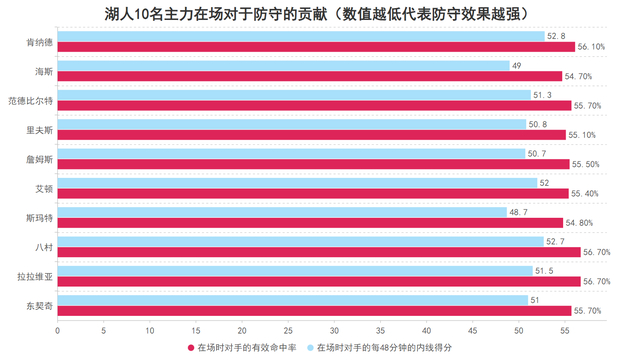 防守端的海斯有些令人意外,作为中锋他在篮下以及近距离都无法令对手的命中率下降,反而防守对手的三分线外投射有明显效果。